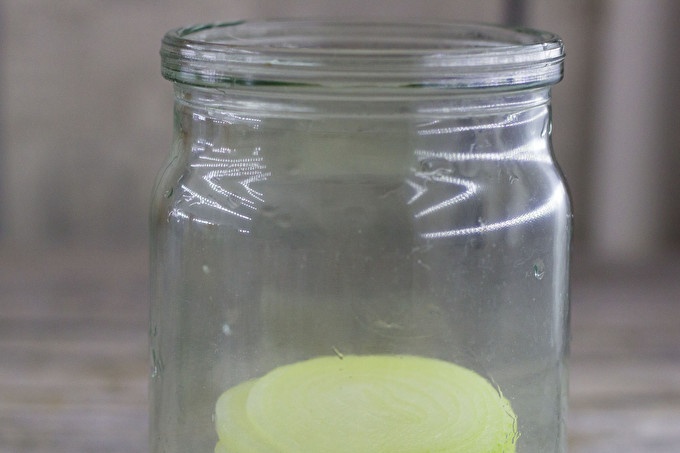 Next, clean the onions from the husk, cut into large rings and put in a jar.