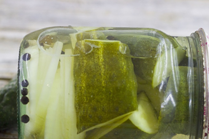 Immediately pour the hot pickle into the jar, cover with a lid and set to be sterilized in a saucepan with warm water for 10 minutes. Close the container scalded screw cap, wrap in a quilt, set to cool for a day. After transferring the seaming for storage in the basement.