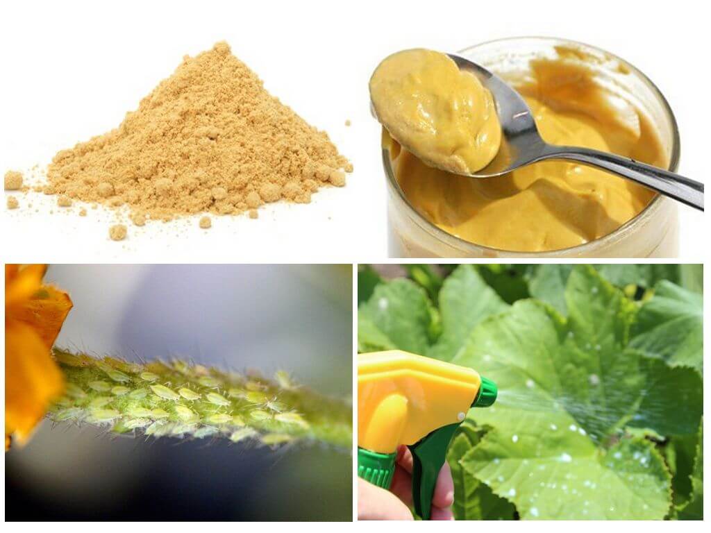 Mustard is used to get rid of aphids or as a prophylactic agent. To do this, prepare a solution of 10 liters of water and 100 g of dry mustard. The liquid is left to stand for a day and diluted with the same amount of pure water. In order to better adhere the solution, grated laundry soap is introduced into it.