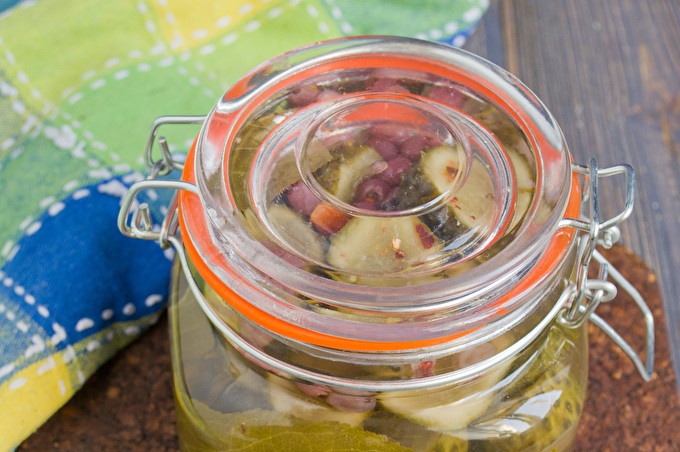 Cooking marinade fill. Pour filtered or spring water into a stewpan, add salt and sugar, put a few bay leaves, coriander, peppercorns and mustard seeds. Bring the pot to the boil, boil for 4 minutes, pour 9% vinegar.