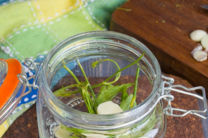Garlic teeth cleaned from the husk, cut into plates, put 2-3 sliced cloves in each jar.