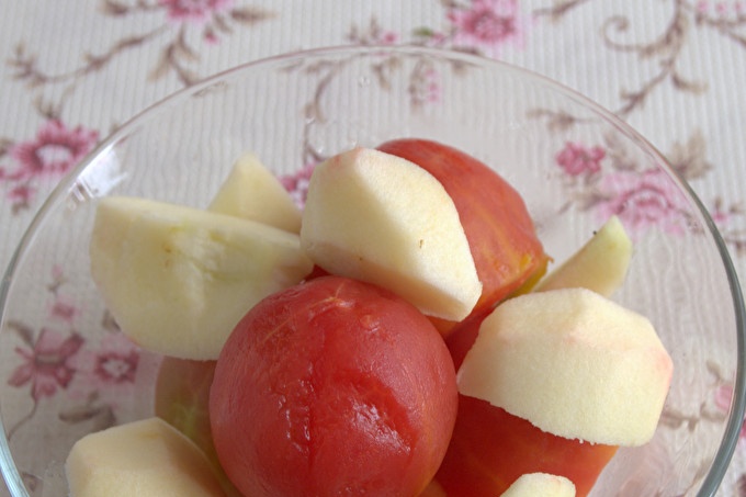 Fill the tomatoes with boiling (boiling) water, wait 4-5 minutes. Remove the cracked skin. Peel the apples and remove the seed box.