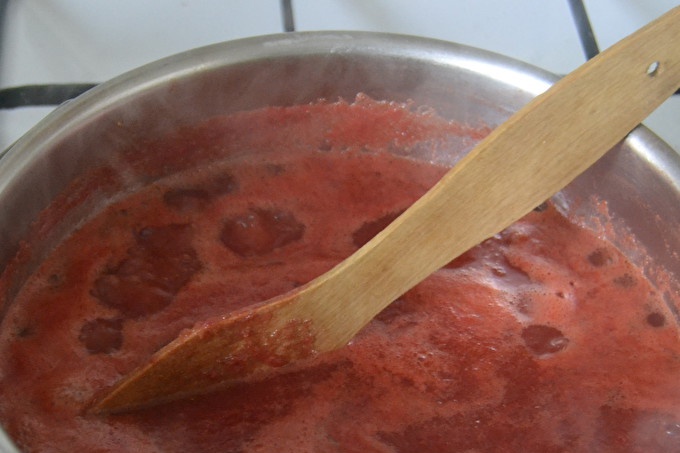 The resulting tomato mass is placed in the cookware, sent to the stove. As soon as the tomato mass boils, we reduce the fire. Now cook the tomato for 2 hours, stirring with a wooden spatula.