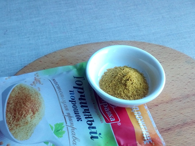 Now add to the resulting tomato 1 tbsp. l mustard powder, mix.