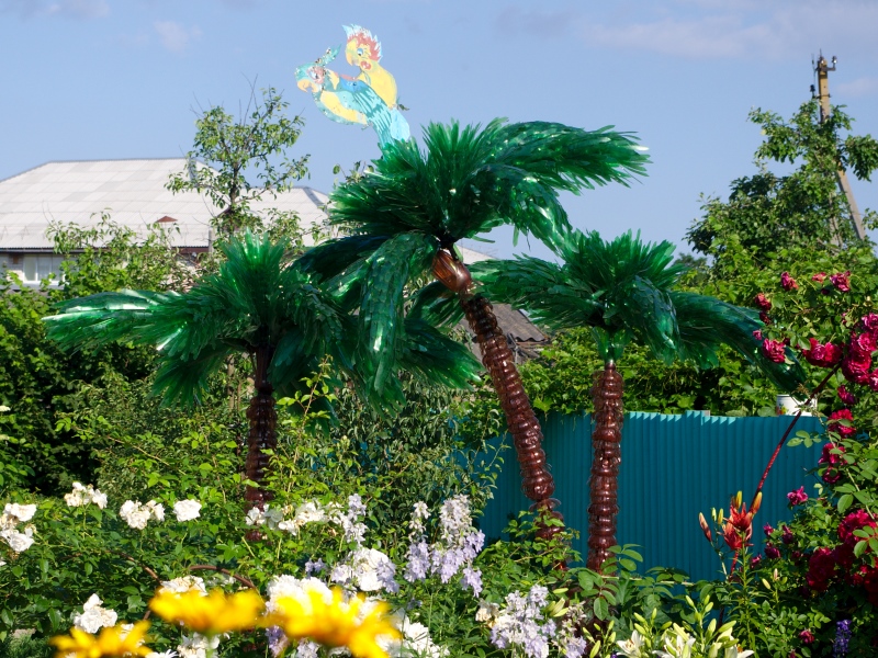 Fancy decoration in the form of a palm tree at the dacha will create the appropriate mood for rest. For the construction of crafts choose the same capacity of brown and green polymer. Think over a frame that will hold an improvised exotic tree. For the barrel you can use curved sticks, PVC pipe.