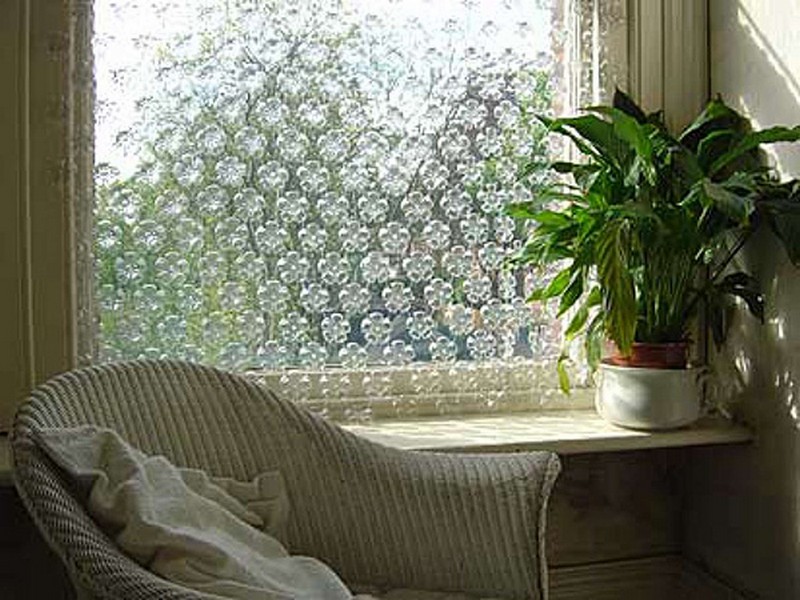 Use plain or multi-colored PET bottles, forming fancy patterns. The self-made curtain will protect from rainfall, an abundance of insects, will dissipate a solar ultraviolet.