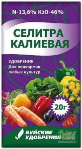 This dressing contains not only potassium, which is needed for seedlings and future fruits, but also phosphorus and nitrogen. Feed nitre and seedlings, and bushes in the garden beds. Norm 1% solution, feeding combined with irrigation. Bred 10 grams per bucket of water.