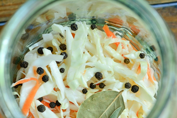 For now, go in for tare. Wash the jars with a small pinch of baking soda and place them for sterilization with steam or other convenient methods. If there is a microwave, use. Metal lids boil for 4-5 minutes. In the cooled jars at the bottom, place a piece of cabbage sliced with carrots, top with pepper and bay leaf.