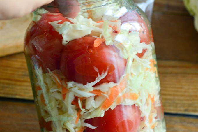 Tomatoes with cabbage for the winter, fingers you will lick