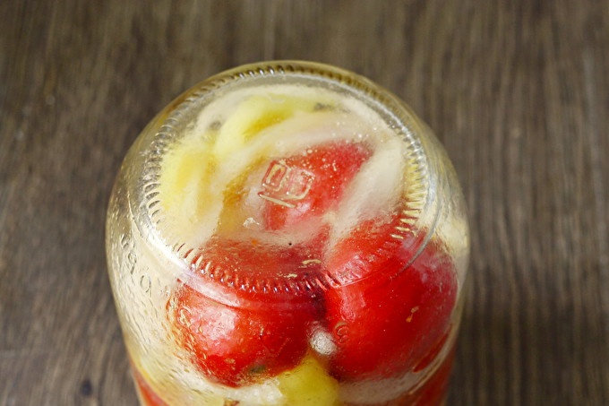 Pour the vegetables into clean and dry jars, tamping them. Then we cover with lids and set to be sterilized in the pan, with the bottom of the cloth closed. Fill it with the same water to the level of the shoulder of the jar and boil for five minutes after boiling. If you took a tare more than 0.5, then sterilize a little longer.
