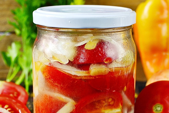 It is not a shame to serve such a snack even on a festive lush table. There are no extra components in the composition. Juicy tomatoes are perfectly combined with Bulgarian pepper and pickled onions. Despite the fact that the salad of tomatoes, onions and peppers for the winter must be sterilized, it is prepared fairly quickly. The set of ingredients is very simple, but the taste of the salad is light and refined.