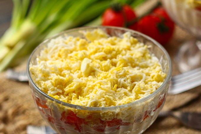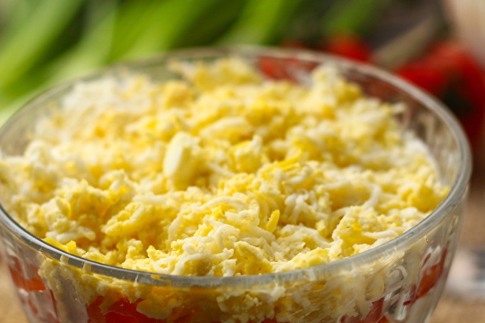 Top salad - grated eggs. It can be served immediately, but it is better to cover the entire lined salad with cling film and refrigerate for impregnation.