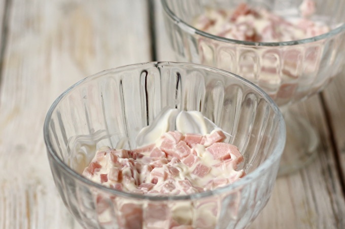 The salad is laid out in layers, so you need to find the appropriate dishes for it - a large transparent salad bowl or several portioned creamer / bowl. Also, the dish can be laid out on a flat plate using a culinary ring. The first layer is ham.