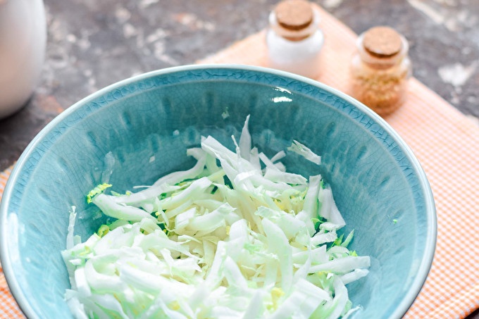 Prepare all the products on the list. Peking cabbage cut into thin strips and shift into a salad bowl.