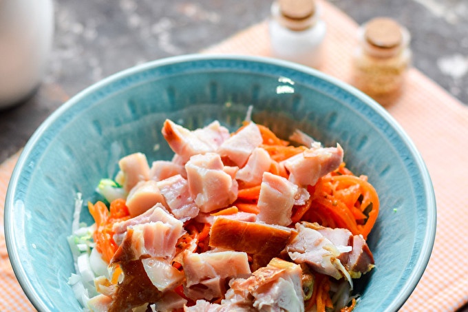 Today we will prepare a salad “Table” with you - a simple recipe will appeal to absolutely everyone, since the salad is amazing. The main ingredient of the salad is smoked chicken, we also add Korean carrots and Chinese cabbage, a little fresh cucumber. Salad with mayonnaise. It is this version of the salad that can be served to the holiday table, all guests will be satisfied. For piquancy, you can add a little garlic to the salad, you can also use different greens. Well, if you like hearty and delicious salad, I suggest to start the process. See the recipe with photos step by step.