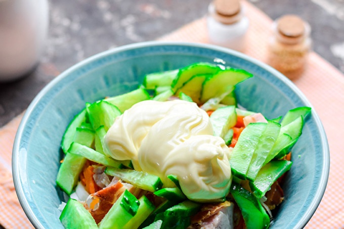 Season the salad with mayonnaise, add salt and pepper, mix. Salad spread out in plates and serve.