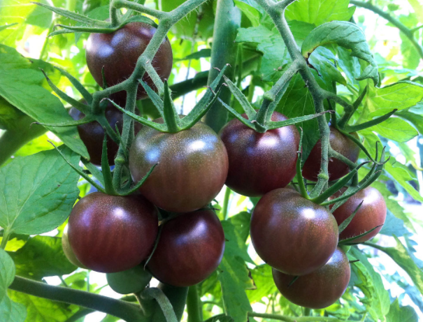 Tomato fruits with an average weight of about 30 g, leveled, smooth, rounded. The skin color is dark cherry with a brown tint. On a section a tomato of saturated dark red color. It has 4-5 seed chambers with small seeds. Very juicy.