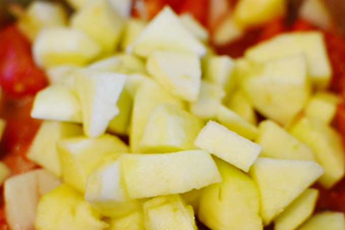 Now go to the apples. They also need to wash, peel and core, then cut as well as onions. Apples add to the rest of the ingredients.