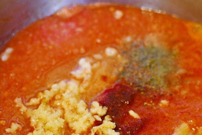 While the tomatoes are boiling, we clean our onion, wash it under running water, and then chop into small cubes. Add the onions to the tomatoes, continuing to cook our sauce, stirring it gently.