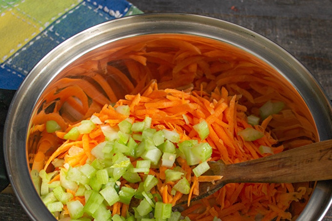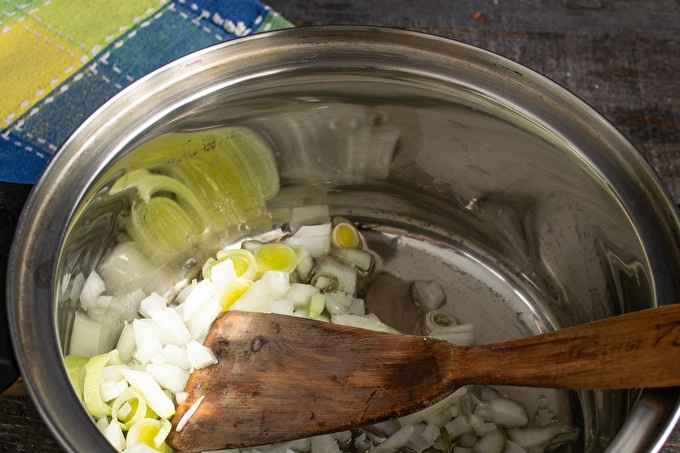 The light part of the stem of a leek cut ringlets. Chop onions finely. Pour olive oil into a saucepan with a thick bottom, put the onion, put it on the stove, pass over moderate heat.