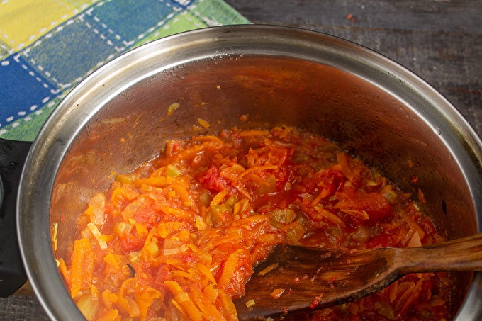 Mash tomatoes with a fork. Close the saucepan with the lid and simmer the vegetables on low heat for another 10 minutes.