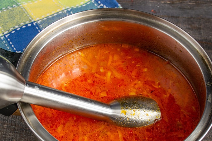 Grind the contents with an immersion blender, salt and pepper to taste, bring to a boil over low heat.