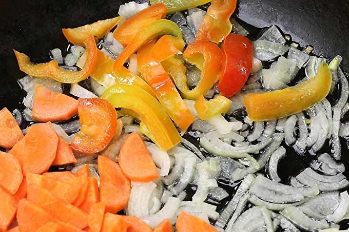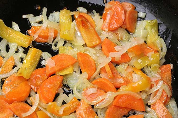 We spread onions in the heated oil, passeruem a couple of minutes, soaking it with oil. Then add carrots, bell peppers.