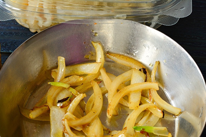 Peel the onion and cut into half rings; if the onion is large, you can chop it into quarters. In a deep frying pan, melt the fat and lay out the onion half rings. Fry to a light golden color over moderate heat.