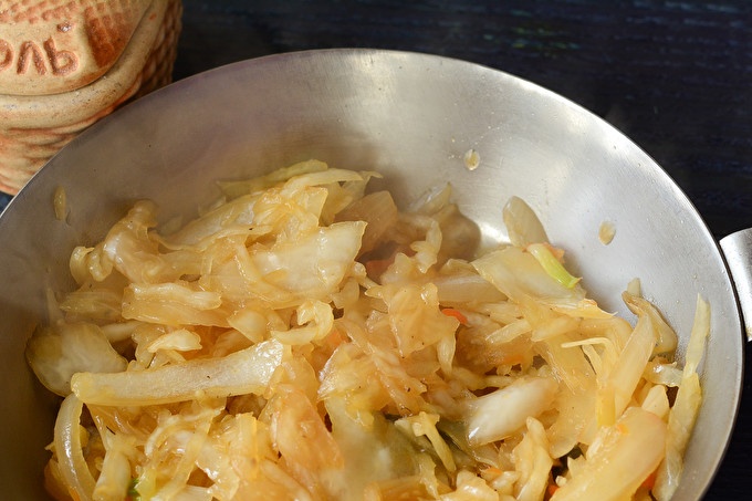 Stir the mixture, pour in 50 milliliters of cold water and cover with a lid. Tomit with periodic stirring for about an hour. If necessary, add water so that the cabbage is quenched in a sour pot, avoiding roasting. Add salt and spices before cooking.