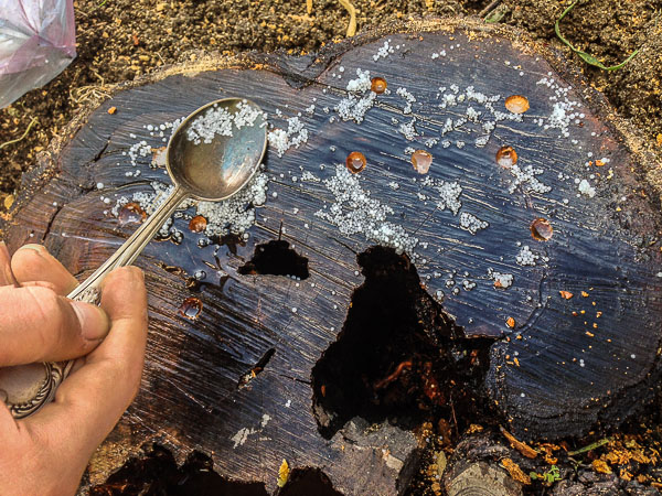When using urea, the preparation of wood is similar. Drill holes and cover with urea (carbamide). Cover with water and cork. With hemp rotting occurs. In 1-2 years it will collapse.