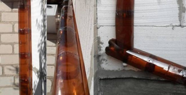 - After mounting the horizontal drain it is necessary to mount the pipe so that water does not flow down the wall - cut the bottom from 1 bottle and fix it to the edge of the gutter with a stapler. Attach the collected waste pipe to the second edge of the bottle.