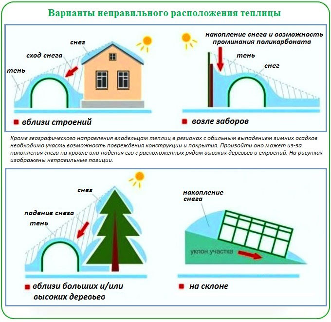 The correct location will be from south to north (meridional) or from east to west (latitudinal). The place should be illuminated by the sun long enough. In the east-west direction, the light day in it will be the longest. In the case of winter greenhouses, this arrangement results in minimal electricity costs.