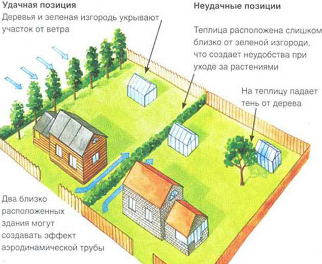 Unfortunately, there is no universal scheme for the location of the greenhouse on the site. If you search the Internet, you can find something similar, but this is not that. Each land plot is universal for many factors and as a result, what can fit in and fit into one area can turn the other into a bunch of unnecessary trash.