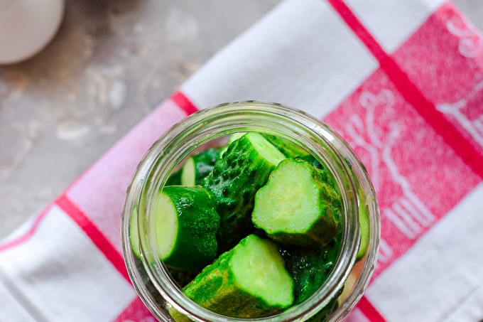 Fill the jar with cucumbers, in the process several times shake the jar so that the cucumbers are more closely lined to each other. Pre-cucumbers must be checked for bitterness and trim tails on both sides.