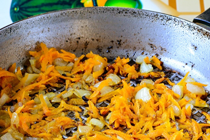Pour some vegetable oil on the pan to fry the onions and carrots. Oil will remain, we will use it later.