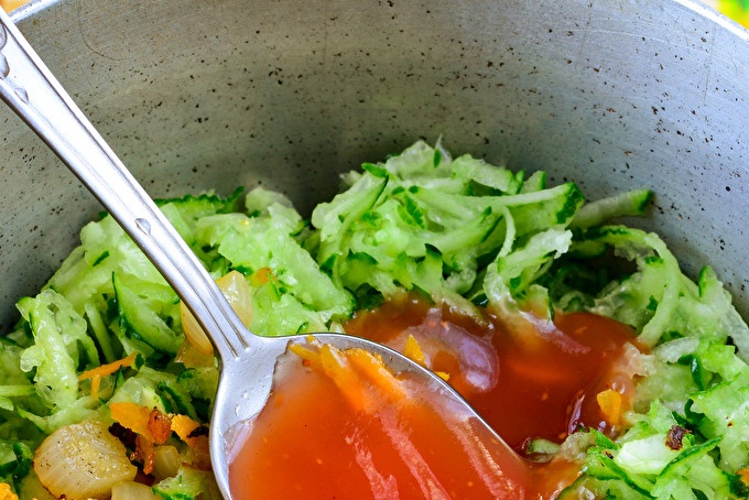 We cut tails off cucumbers and check if they are bitter. Then grate cucumbers, better on large ones.