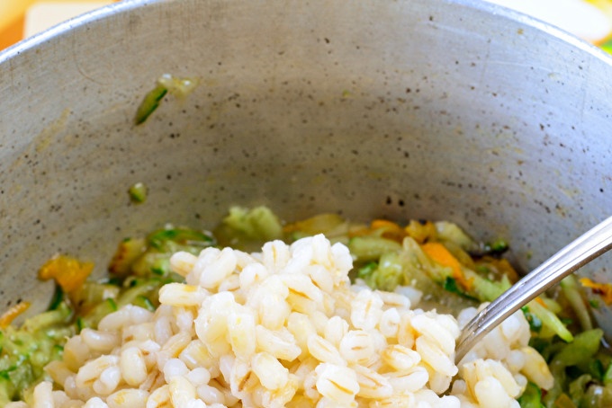 When the vegetables are softer, add boiled barley there. After 10 minutes of quenching pour vinegar and wait for the boil.