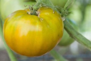 Tomatoes ripen in weight of 150-300 g, the skin is green with a lot of yellow patches. The shape of the fruit is flat-round, with pronounced ribbing. Variety Bog grown for canning, fresh consumption. The pulp is dense, perfectly cut, suitable for salads.